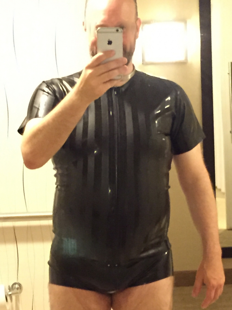 I know this will embarrass Nomicon, but I already knew we had a potential fashion disaster before he arrived. He works in Silicon Valley, and although he is developing sartorially, he is still happiest in a polo shirt and chinos – which would be completely inappropriate at Domcon. So I arranged to meet him downstairs after he registered and immediately took him into the vendor hall. Fortunately we very quickly found him a nice broad pinstrip black latex top and shorts which he would wear throughout the event. Actually there were periods when it chafed a little and he snuck back into geek wear, but he wore it most of the time, and indeed it got very many compliments.